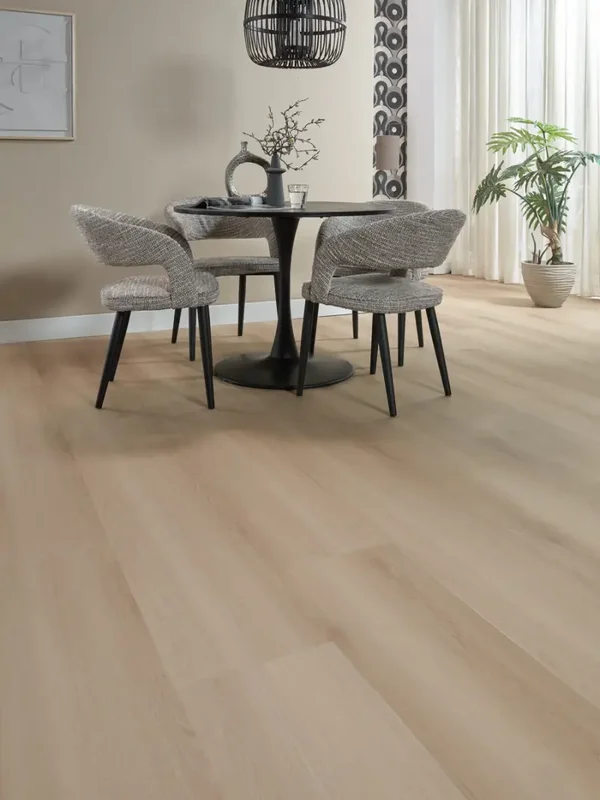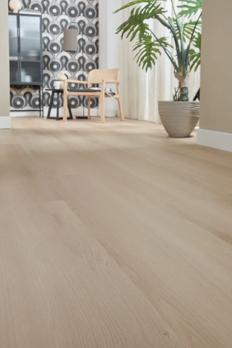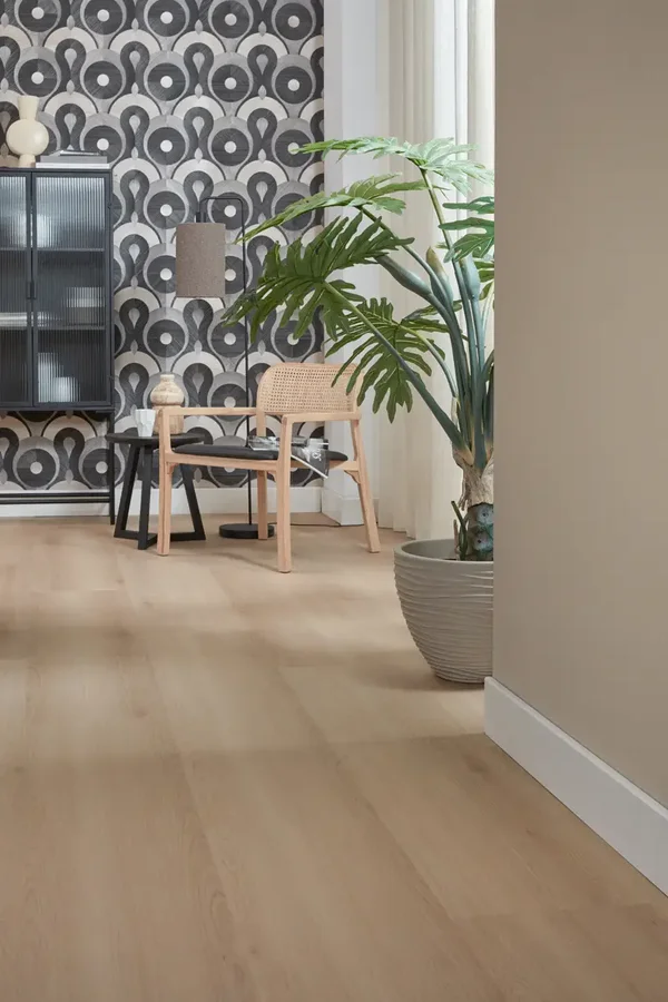De Floer Landhuis PVC – Lichtbruine Eik brengt warmte en sfeer in elke ruimte met extra brede XXL planken en een zachte, lichtbruine eikenhoutlook vol karakter. De royale planken van 154 cm lang en 31 cm breed zorgen voor een open en ruimtelijk effect in jouw interieur. Deze rechte plank PVC vloer past perfect bij iedere woonstijl, of je nu houdt van een landelijke, klassieke stijl of juist een modern interieur. Geniet van de natuurlijke eikenlook, gecombineerd met alle voordelen van Floer PVC.